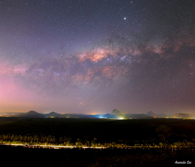 With the perfect conditions, I made my way towards Sunshine coast to capture the Milky Way setting over Glass House Mountains. Reaching the top of the Wild Horse Lookout, I was treated to a spectacular view of the mountains facing west.