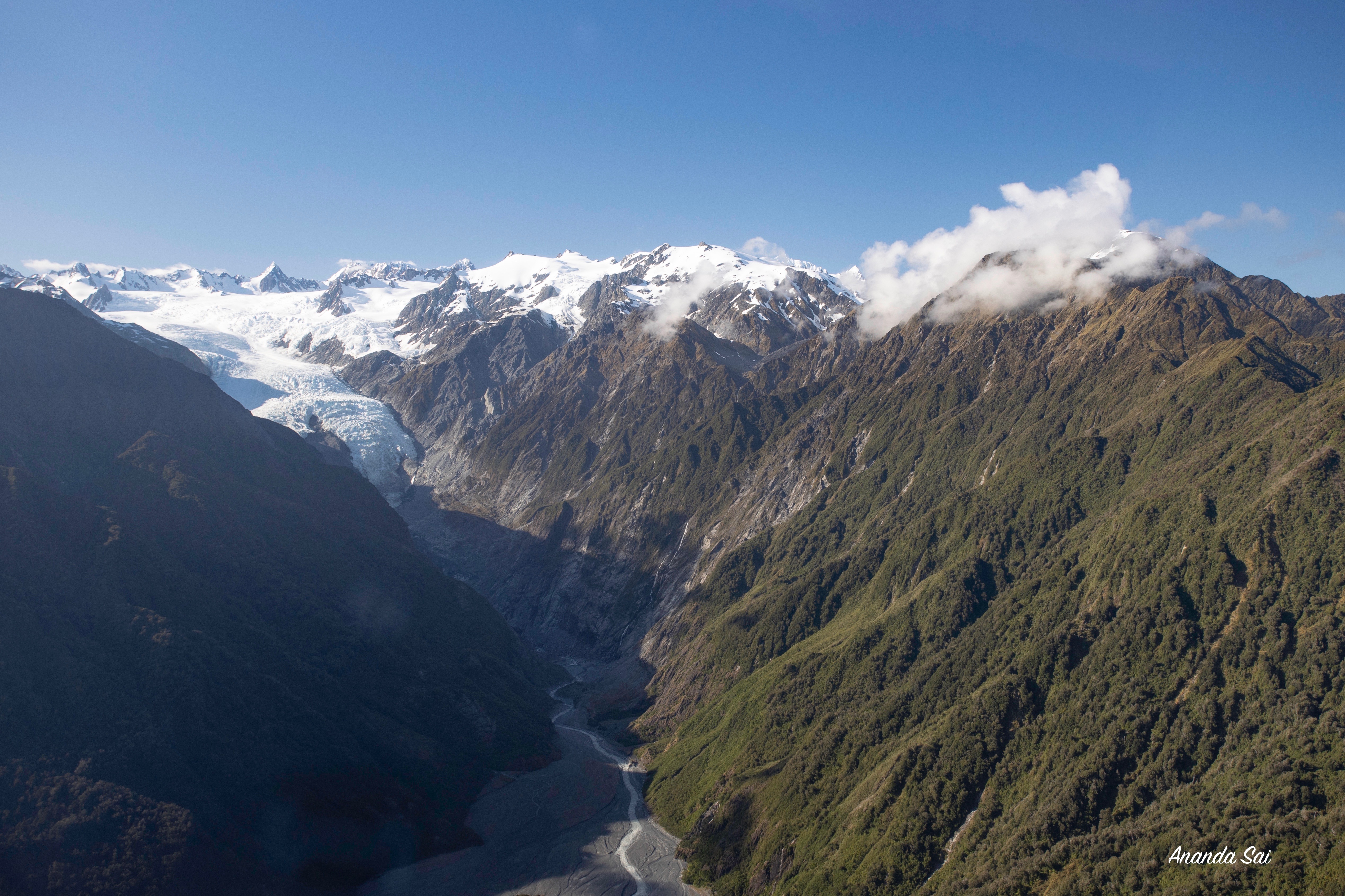 Flying around the corner, we were awe-struck seeing the glaciers for the first time ever. It was beautiful to see millions of years of ice sitting there nestled between mountain peaks. As it slowly moves carving out fiords behind it. It was a feeling of mixed emotions as we realised that witnessing this beautiful natural glacier could only be achieved through a helicopter flight and that 20 years ago, you could walk to the base of it. Wishing that was not the case now, with climate change, it is a reality. I still feel happy and appreciative of the fact that I had the opportunity to see a glacier for the first time and the opportunity to capture it. I wish to translate the feeling of gratefulness through this image in your living space.