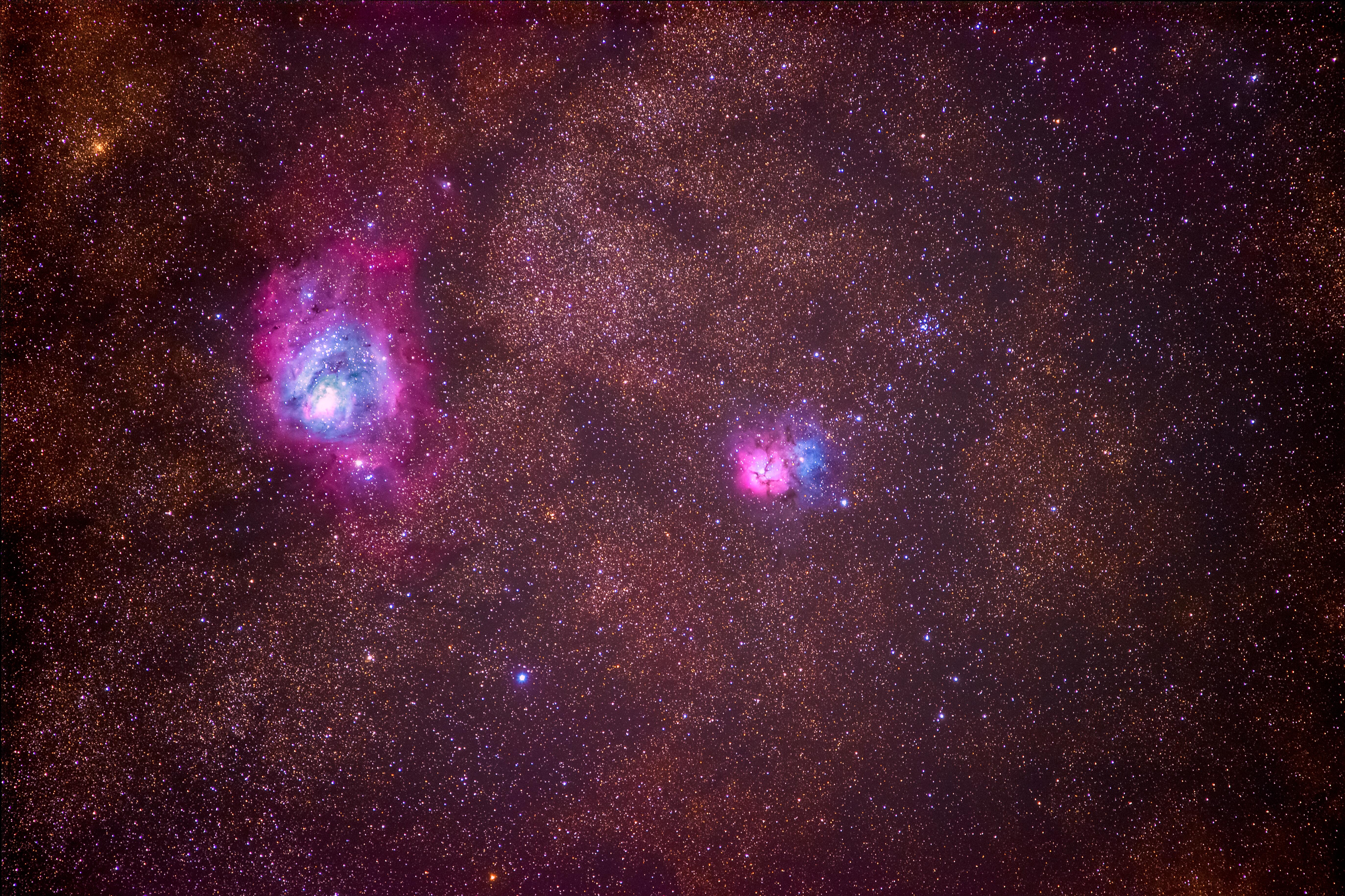 Peering deep into the centre of our Milky Way lies the bright and colourful Lagoon and Trifid Nebulas. Located in the Sagittarius constellation, these nebulas are one of the very few nebulas that can be seen faintly with the naked eye. This image was captured on my journey through Northern Territory where we were treated to some of the darkest skies in the world. Isolated regions where the stars shine so brightly and our eyes are exposed to the true depth and scale of the Universe above.