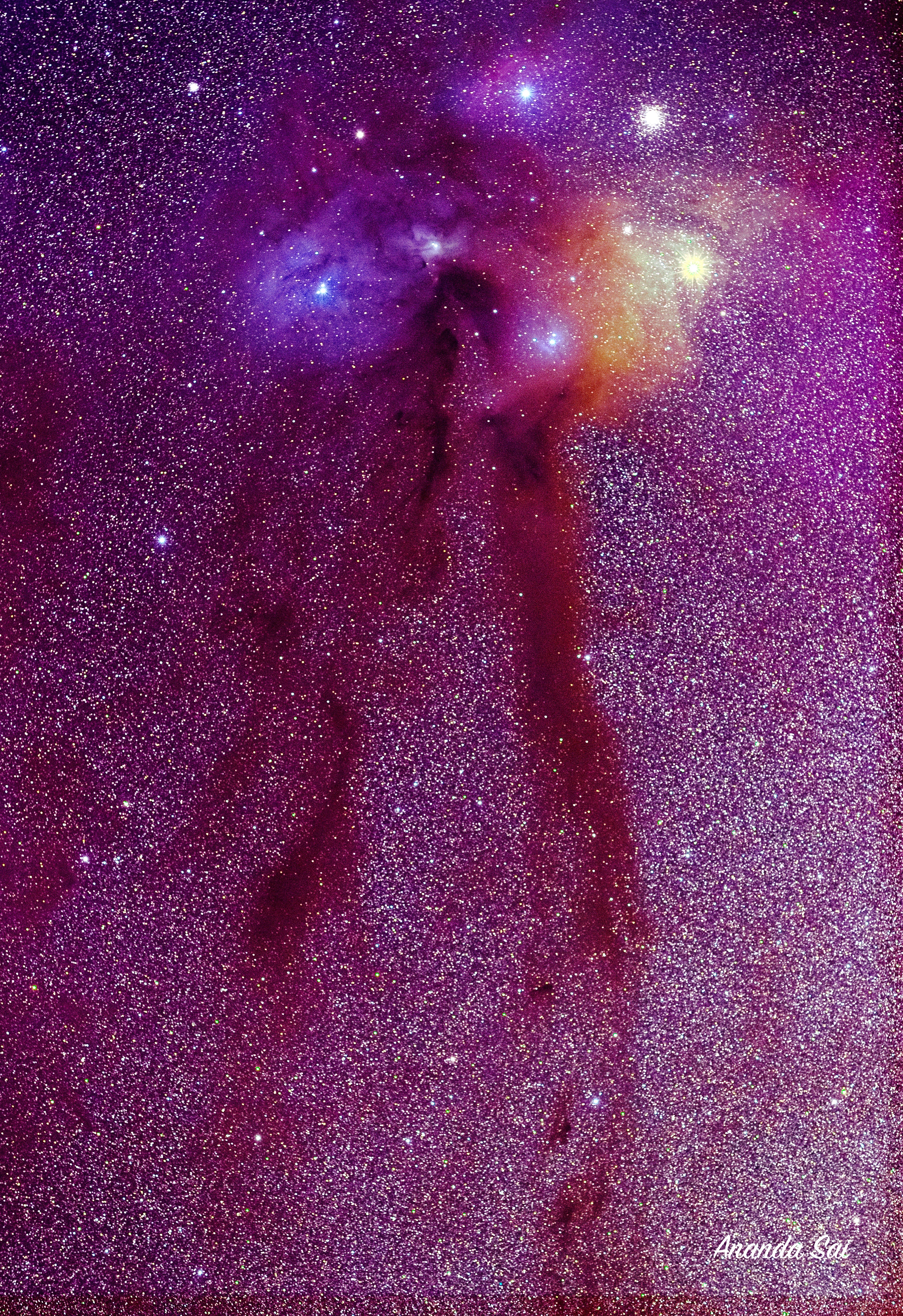 Located 430 light years from us, this beautiful dark cloud complex is a dark nebula lit up by young and old stars alike.