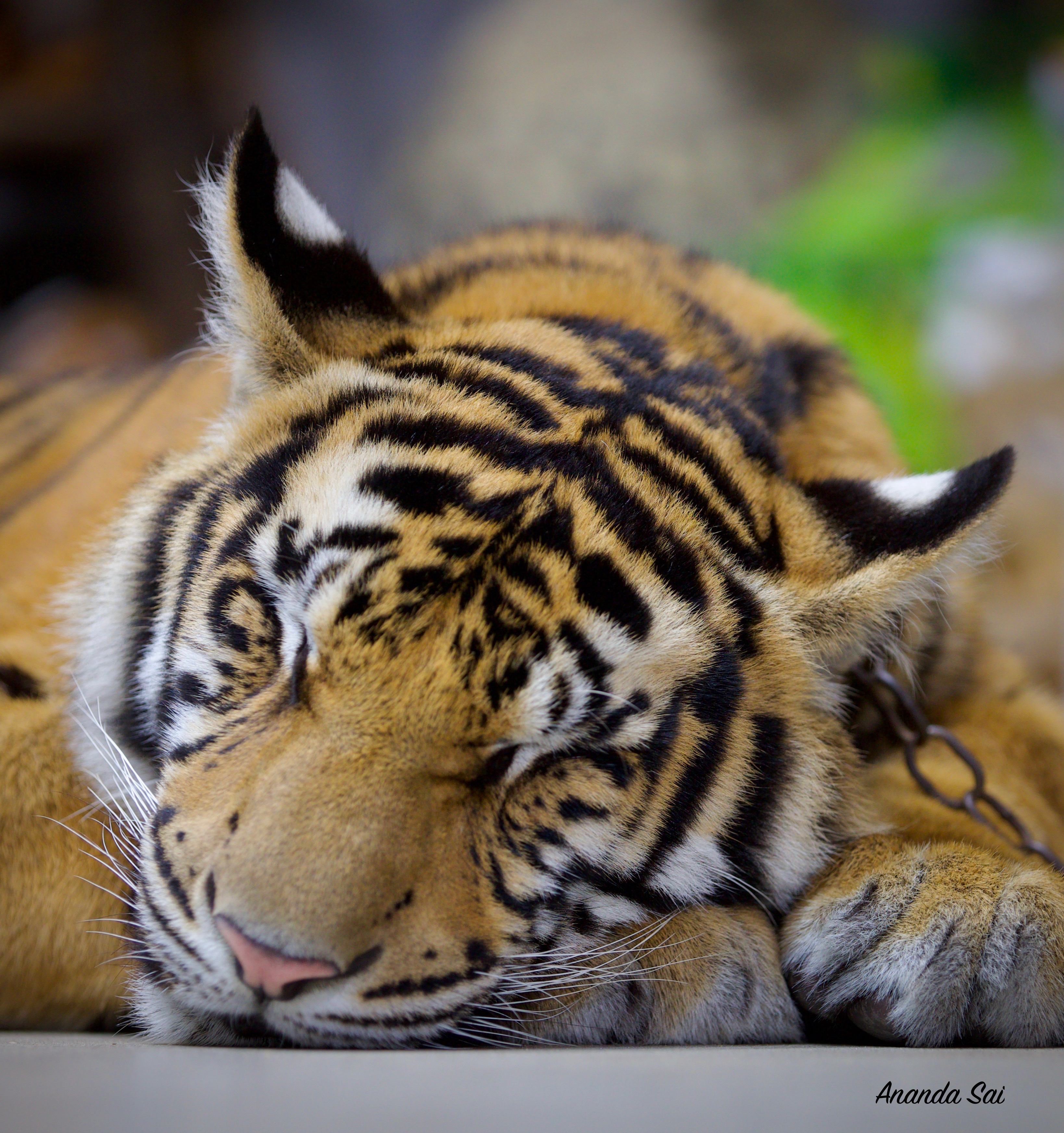 Taken at Dreamworld, Javi was out for his usual day walk around the park when he decided to have a power nap on the Tiger Island floor .