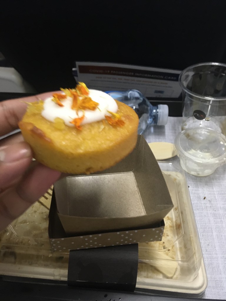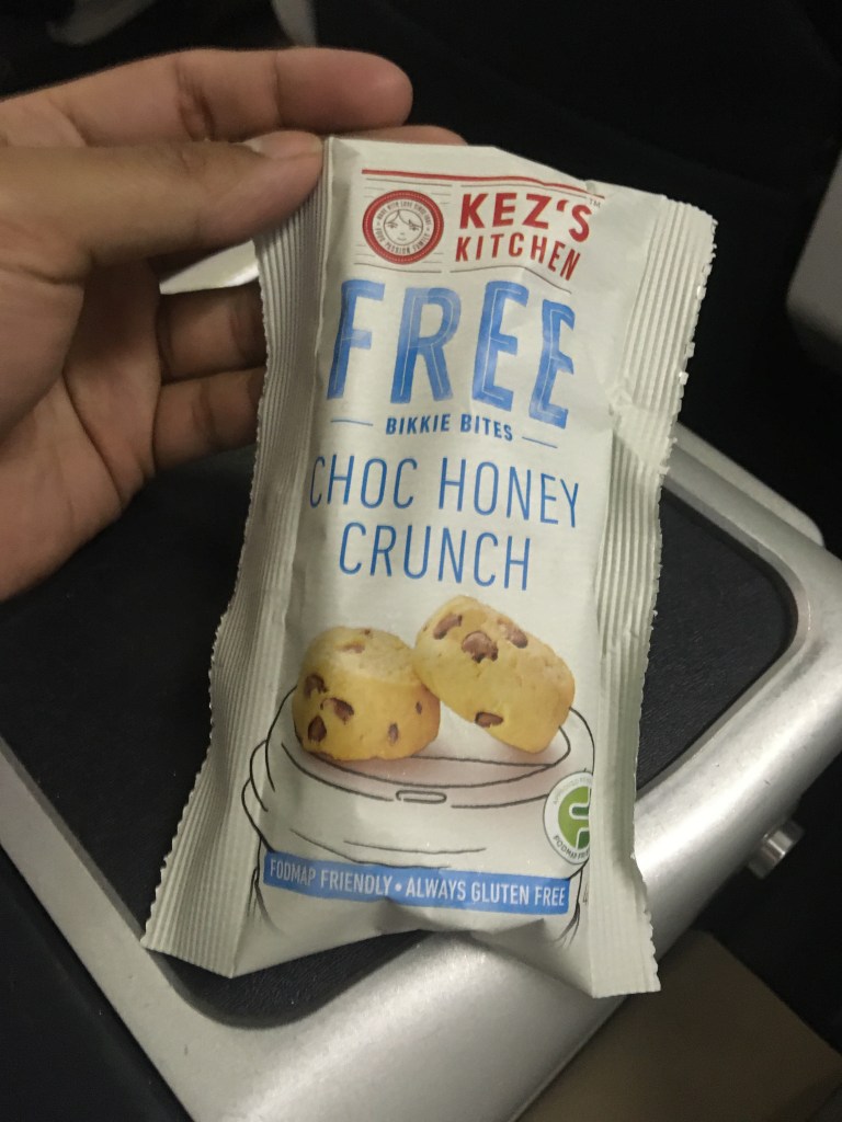 The 2 meal options were hot lamb or a veg haloumi salad along with a choice of an alcoholic or non-alcoholic drink. As I am a vegetarian, I opted for the haloumi salad. It was served with a can of coke and a glass, with bread, butter and a tasty dessert which was orange cupcake. The salad consisted of chickpeas and haloumi which was tasty though a teeny bit dry. The orange cupcake was splendid and my highlight for the meal. Later during the flight, I was given choc honey crunch cookies as a snack.